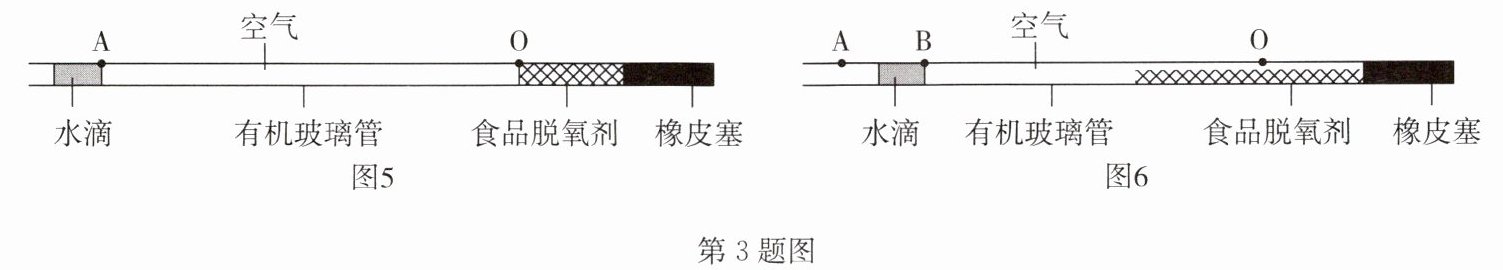 ②将食品脱氧剂粉末迅速装入玻璃管,立即向管口注入一滴水将玻璃管密封,弹动玻璃管使脱氧剂粉末紧密分布在橡皮塞一端,待水滴不再移动后,水滴的最右端标为A,脱氧剂的最左端标为O,如图5所示;