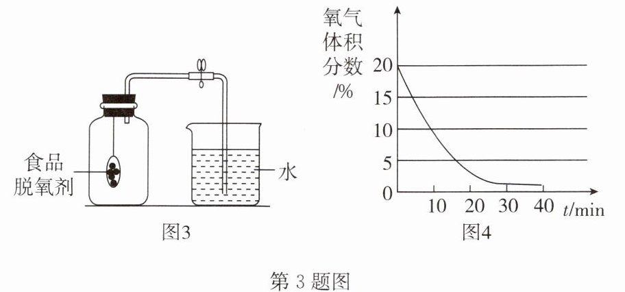 (3)乙组同学查阅资料发现食品包装中的脱氧剂能吸收氧气,于是他们改用脱氧剂来测定空气中氧气的含量(装置如图3)。利用数字传感器测得该装置中氧气的体积分数随时间的变化曲线如图4所示。改进后的优点是