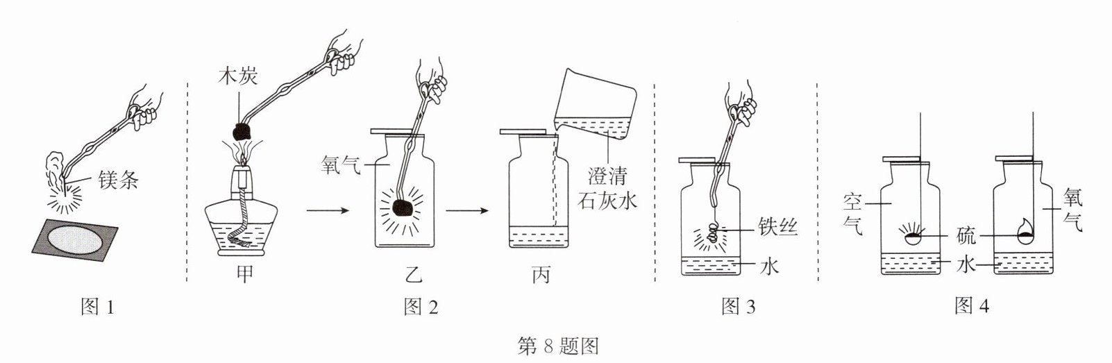 $8.(1)Mg+O₂\overset{点燃}{→}MgO (2)$澄清石灰水变浑浊