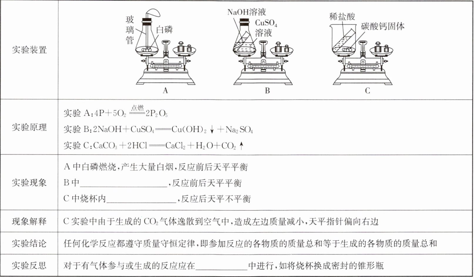 7. A 下列是验证质量守恒定律实验,填写相关内容。