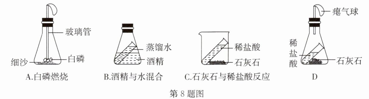 8. B 质量守恒定律表述为参加化学反应的各物质的质量总和等于反应后生成的各物质的质量总和。(提示: $ CaCO_3 + 2HCl = CaCl_2 + CO_2 \uparrow + H_2O $)