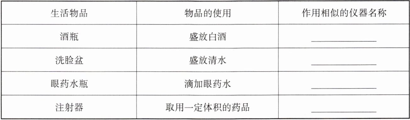 13. B 生活中,有许多物品的使用与实验室中仪器的作用相似。请在初中化学常见实验仪器中选择作用相似的仪器,将其名称填入下表中对应的位置。