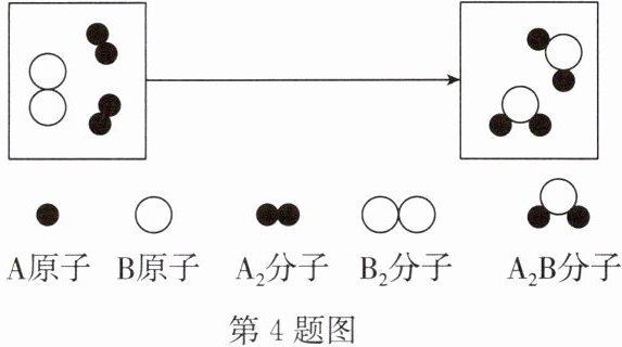 )[img]图片内容为某化学反应过程的微观示意图,左框中有两个由两个白球构成的整体(表示B₂分子)和两个由两个黑球构成的整体(表示A₂分子),经过反应后得到右框中的两个由一个白球和两个黑球构成的整体(表示A₂B分子)。其中一个黑球表示A原子,一个白球表示B原子,两个黑球构成的整体表示A₂分子,两个白球构成的整体表示B₂分子,一个白球和两个黑球构成的整体表示A₂B分子。[/img]