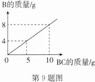9. B 在化学反应 $ {A_{2} + BC\xlongequal{}B + A_{2}C} $ 中,反应物 BC 与生成物 B 的质量关系如图所示。若 2 g $ {A_{2}} $和 80 g BC 恰好完全反应,则生成 $ {A_{2}C} $的质量为 ( )
