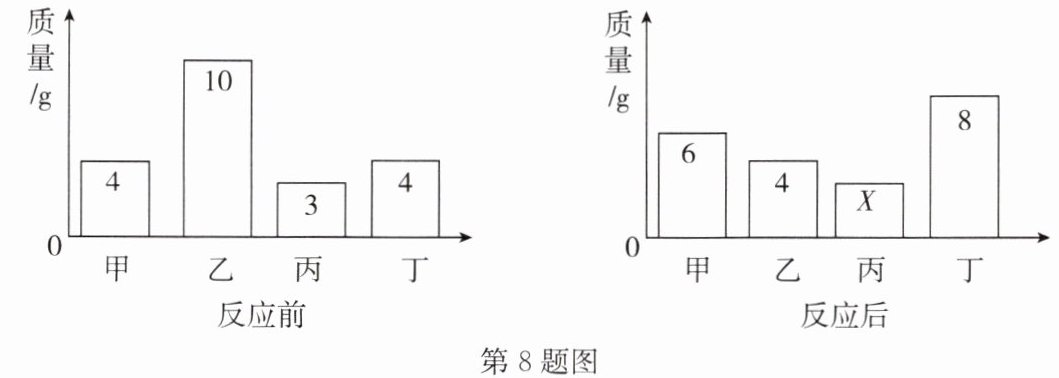 [img]图片内容为反应前后各物质的质量变化,左图为反应前,甲的质量为4g,乙的质量为10g,丙的质量为3g,丁的质量为4g;右图为反应后,甲的质量为6g,乙的质量为4g,丙的质量为Xg,丁的质量为8g。[/img]
