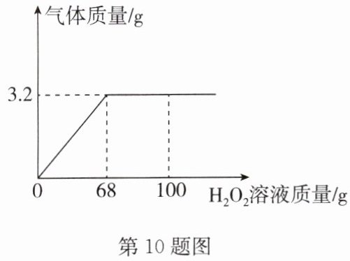 10. A 实验室用过氧化氢溶液和二氧化锰来制取氧气,所得氧气的质量和消耗过氧化氢溶液(溶液中有过氧化氢和水,水不参加反应)的质量关系如图所示。