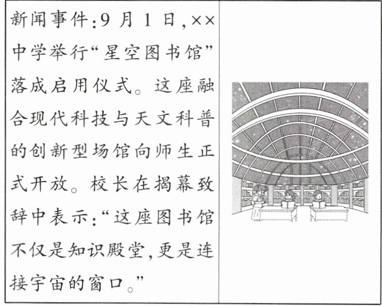 示例:9月1日,xx中学“星空图书馆”正式开放,玻璃穹顶融合天文观测功能,学生课余可“仰望星空阅读”,校长表示,让知识连接宇宙,点亮求知好奇心。(3分)