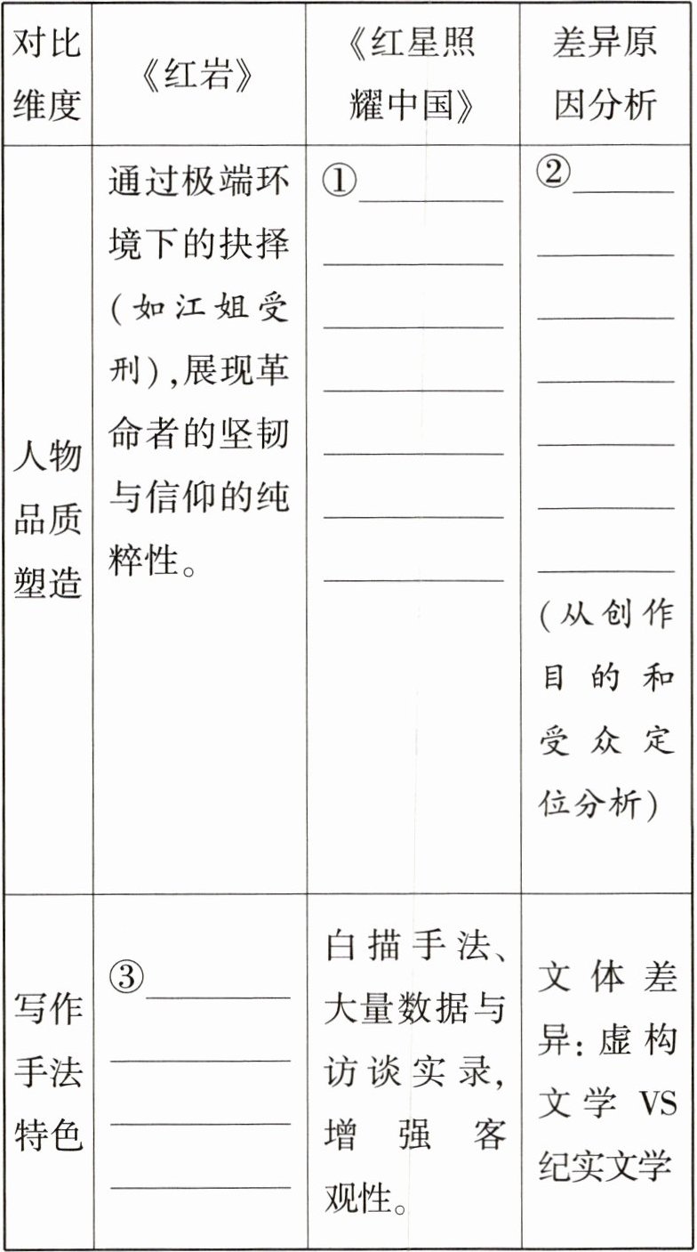 (1)①示例:通过日常言行与细节(如毛泽东穿补丁衣服)体现革命领袖的朴素与务实。 ②《红岩》受众为国内群众,需要突出英雄主义精神,以激励民众;《红星照耀中国》受众为国际社会,需破除西方对"赤匪"的污名化,故用真实细节证明革命者的理性与人性。 ③示例:象征手法(如"红岩"象征革命者的不朽)、强烈的抒情色彩。(每空2分)