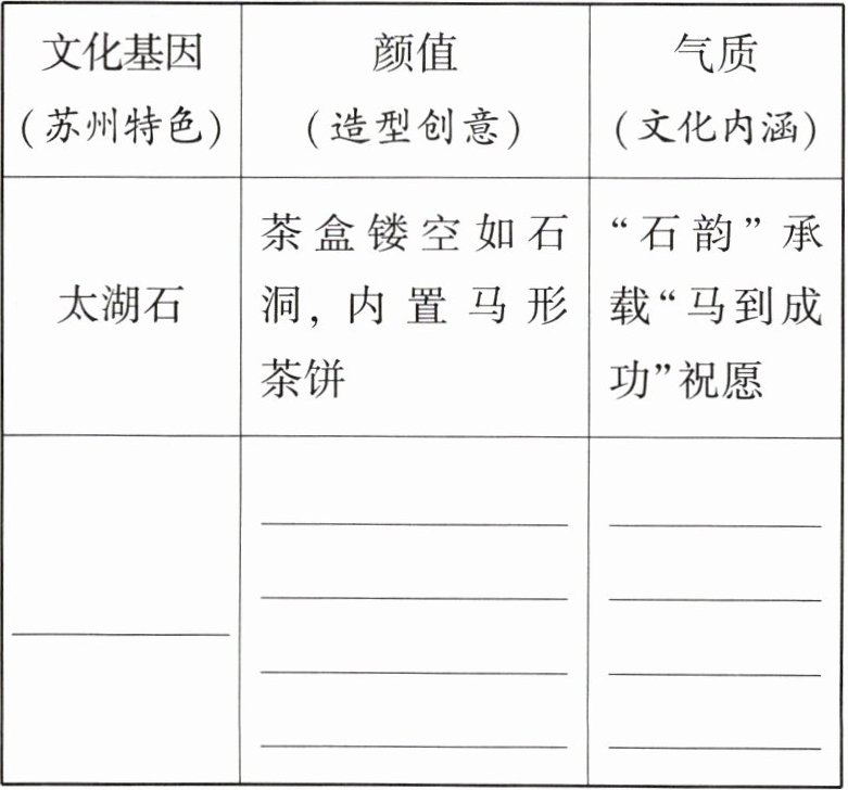 (2)苏州碧螺春茶厂拟推出马年限定茶礼盒,请你结合下表设计一款文创产品。(3 分)