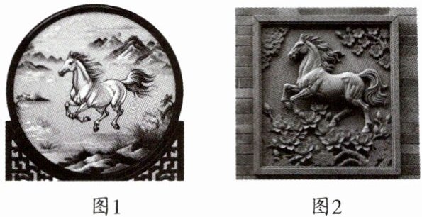 (1)活动展出一件苏绣双面屏《天马行空》(见图1:绣面白马腾云,背景为太湖山水)和一座灰塑砖雕《马踏芳菲》(见图2:砖雕骏马蹄下点缀玉兰花枝)。任选其一,完成解读。(描述画面及阐释寓意)(4 分)