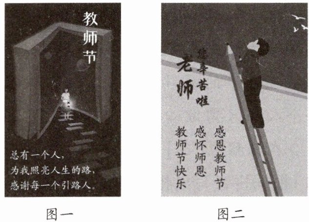 (1)示例一:图一。在该海报中,从书里面走出来一个人,手上提着一盏灯,照亮了前行的路,能让人真切感受到对引路人——老师的感激之情。 示例二:图二。在该海报中,一个人借着铅笔做成的长梯,攀过高墙看到了远方的天空,让人真切感受到对筑梯人——老师的感激之情。(2)示例:您像“π”般永无止境传授智慧,用“√”为我们解开难题的束缚;笛卡尔说“我思故我在”,而您教会我们用逻辑丈量世界——致敬永远严谨的数学引路人!(3)示例:去年运动会有同学摔倒时,您说“疼痛是成长的印章”,这句话背后有什么教育思考?您认为人工智能时代,老师最不可被替代的能力是什么?