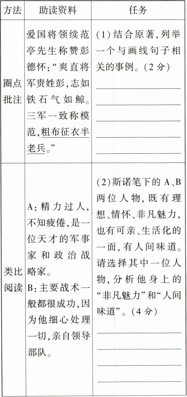 |圈点批注|爱国将领续范亭先生称赞彭德怀:“爽直将军贵姓彭,志如铁石气如鲸。三军一致称模范,粗布征衣半老兵。”|(1)结合原著,列举一个与画线句子相关的事例。(2 分)________________________|