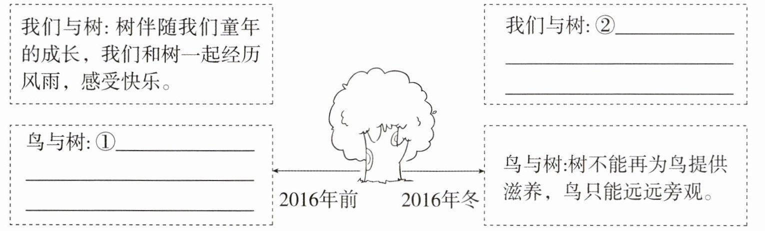 | 我们与树:树伴随我们童年的成长,我们和树一起经历风雨,感受快乐。 | 我们与树:②______ |