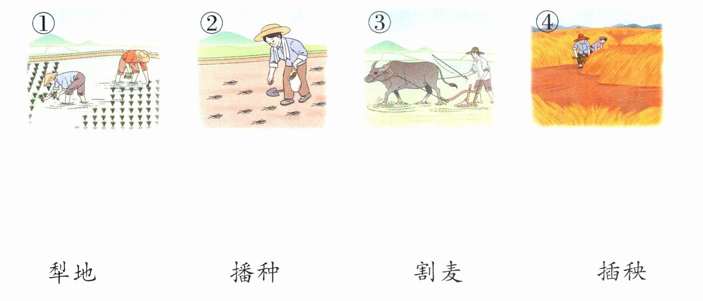 1. 丛林 四季 松柏 桂树 谷 杨 飞鸟 园林 保护 队 世界 事 2. 部首 扌 9 糸 4 sōu suǒ 3. ①——插秧 ②——播种 ③——犁地 ④——割麦