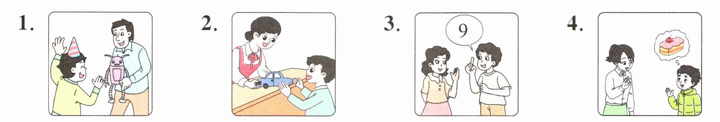 1. some lovely cars 2. come here 3. How old, eight years old 4. Happy Birthday, Thank you