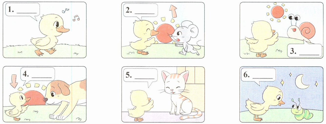 六 新趋势 绘本阅读 小鸭子 Ann 在散步途中遇到了其他小动物。仔细观察图片,从方框中选择合适的句子补全绘本,填序号。