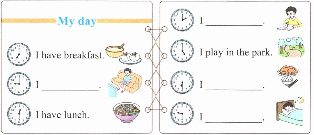 从左到右依次为:watch TV, do my homework, have dinner, go to bed