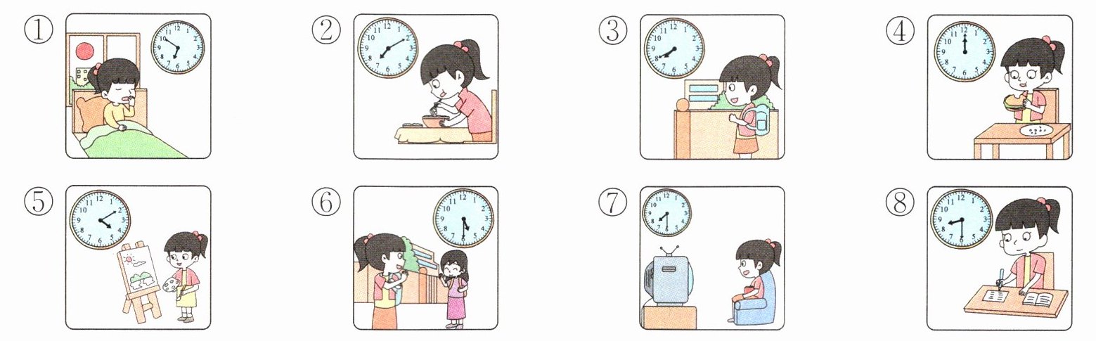 get up, at seven ten, go to school, have lunch, drawing lesson, go home, watch TV, do my homework