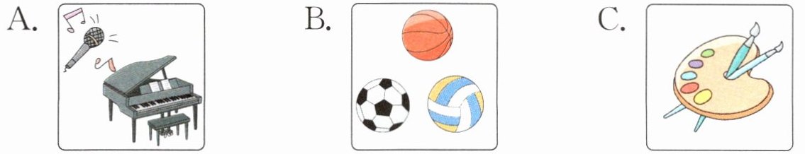 请根据同学们对自己兴趣爱好的描述,选择相应的图片。