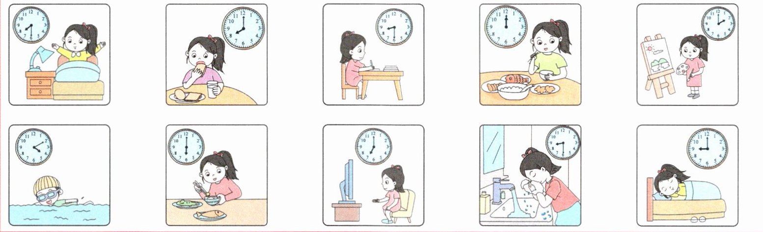 have breakfast,do,homework,draw a picture,four ten,dinner,six o'clock,watch TV,wash my face
