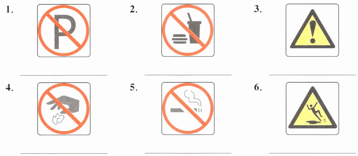 1. No parking. 2. No eating or drinking. 3. Danger! 4. No littering. 5. No smoking. 6. Wet floor.