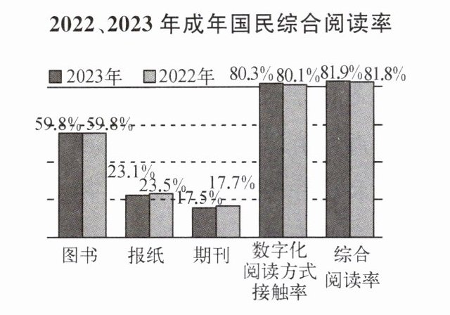 A. 第二十一次全国国民阅读调查结果显示,2023年我国成年国民综合阅读率稳步上升,0~17周岁未成年人阅读也有了持续的进步。