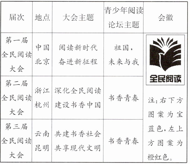 6. 材料一中全民阅读大会会徽的图案设计主题鲜明、构思新颖。你从中读出了哪些寓意?(4分)