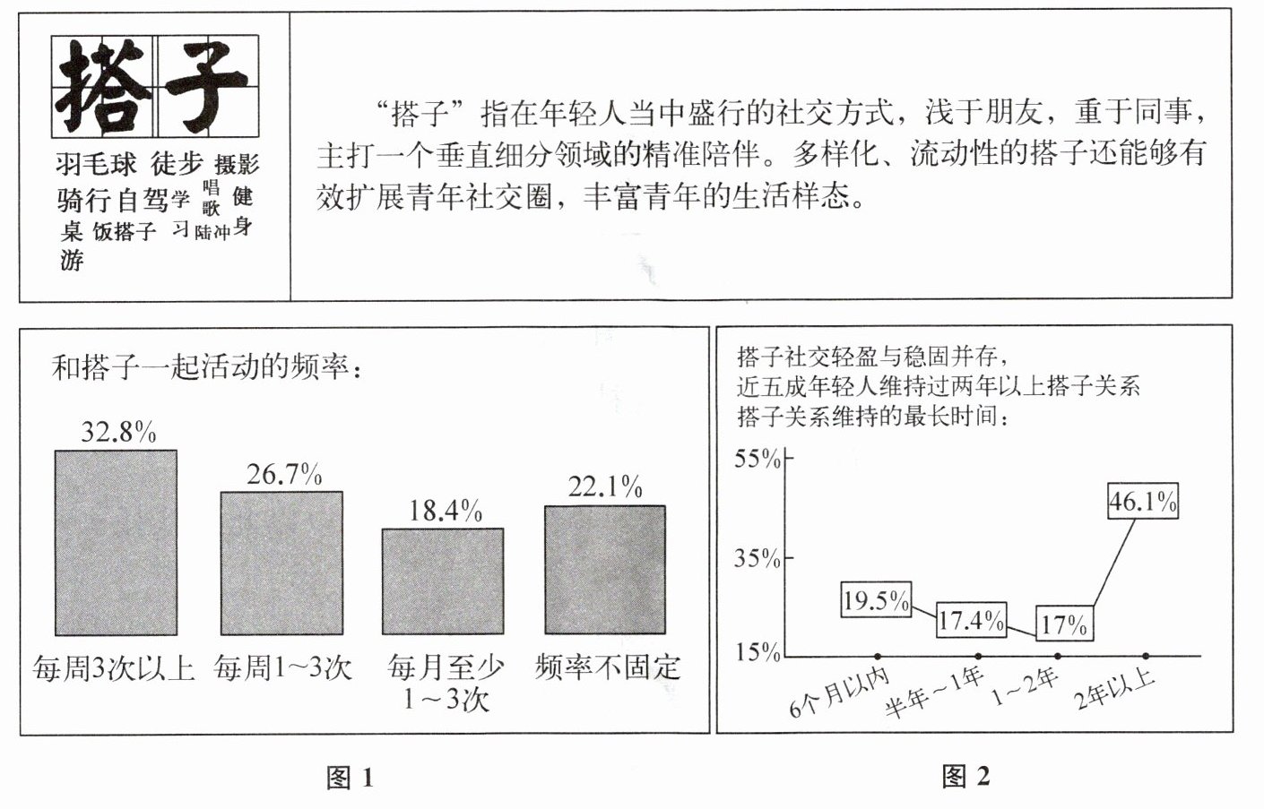 2. 阅读材料一的两个图表,简要概括调查结果,并针对调查结果,就“搭子”这一社交方式发表你个人的看法。(4 分)