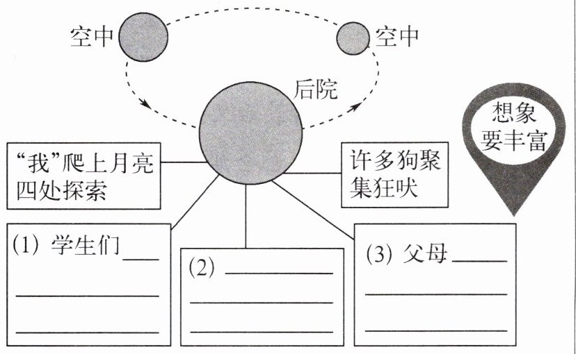 1. 月亮“停留在我们的后院”,小镇发生了哪些不寻常的事?阅读绘本,补全思维导图。(3分)