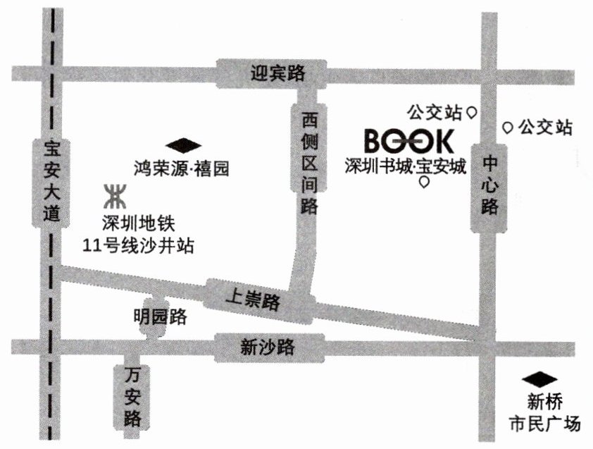 2. (思维提升)小深同学从地铁11号线沙井站出站后步行前往深圳书城宝安城,请根据材料二中的文字和图片为小深同学大致描述一下出站后前进的方向和距离,要求描述中至少要有一个方位名词。(3分)