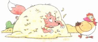萝丝继续往前走,它越过干草堆,狐狸眼看就要靠近母鸡了,它向前一扑,却一头扎进了干草堆里,狼狈不堪。