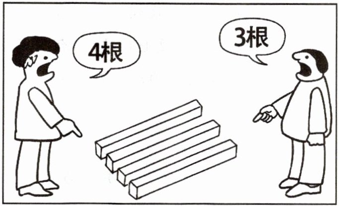 4. 与第③段相配。(1分)图中站在左边的人说是4根,站在右边的人说是3根;(1分)每个人所处的位置不同,看到的也有所不同。(1分)这正如第③段所说“生活中,只从自己的角度看问题的例子比比皆是”。(1分)
