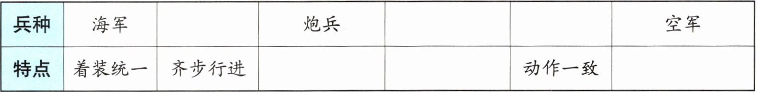 1. 抓住文中描写的各军兵种及其特点,填写表格。