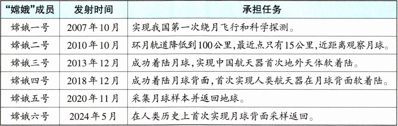 解析:本题考查有目的地阅读及提取信息。材料一通过表格的形式,清晰直观地介绍了我国探月工程的发展历程以及取得的成就;材料二主要介绍了嫦娥六号探测器在月背采样的历史性意义。