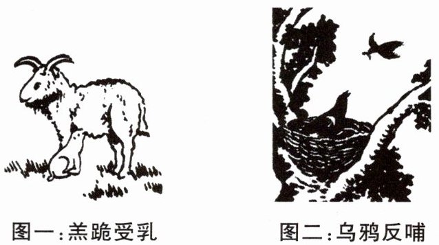 (1)图一示例:在这幅名为《羔跪受乳》的漫画中,一只站立的母羊正在给羊羔喂奶,羊羔后腿弯曲坐在地上,前腿下跪,正在吮吸乳汁。 图二示例:在这幅名为《乌鸦反哺》的漫画中,枝叶茂密的大树上,有一个鸟巢,巢内有一只母乌鸦。一只小乌鸦衔着食物飞来,准备把食物喂进巢内母乌鸦张开的嘴中。(2分)
