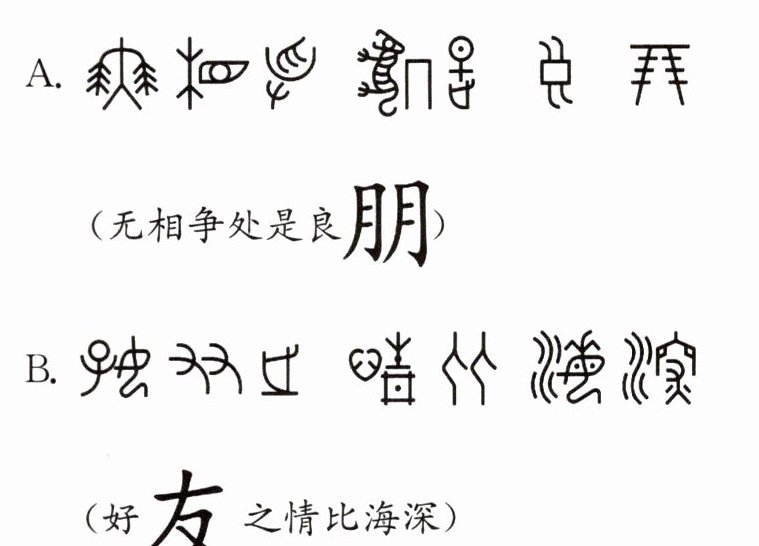 (2)"朋"像两串贝壳系在一起,突出交往双方的品性都如贝壳般珍贵;(1分)"友"像两手交握,表示亲近。(1分)二字都设计成并列形式,凸显了"朋友"互相依靠的关系。(1分)