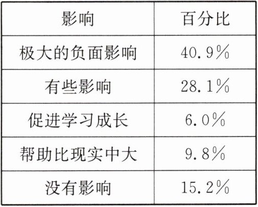 (3)结论:网友对中学生的影响以极大的负面影响为主。(1分) 建议:增强网络安全意识,审慎选择交友对象;家长和学校应加强对中学生的网络教育和引导,帮助他们树立正确的网络交友观念;合理安排时间,避免过度沉迷于网络交友,影响学习和生活。(每点1分)