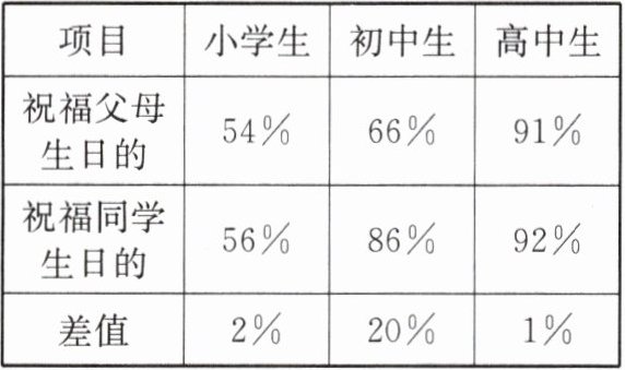 示例:随着年龄的增长,关注父母生日和关注同学生日的学生越来越多,(2分)但初中生对父母生日的关注度远远低于对同学生日的关注度。(1分)