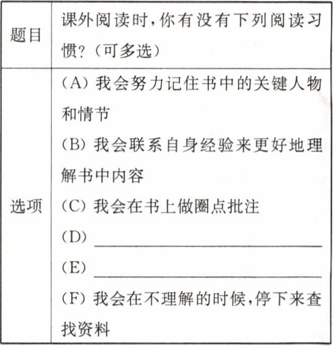 |选项|(A) 我会努力记住书中的关键人物和情节(B) 我会联系自身经验来更好地理解书中内容(C) 我会在书上做圈点批注(D)______(E)______(F) 我会在不理解的时候,停下来查找资料|