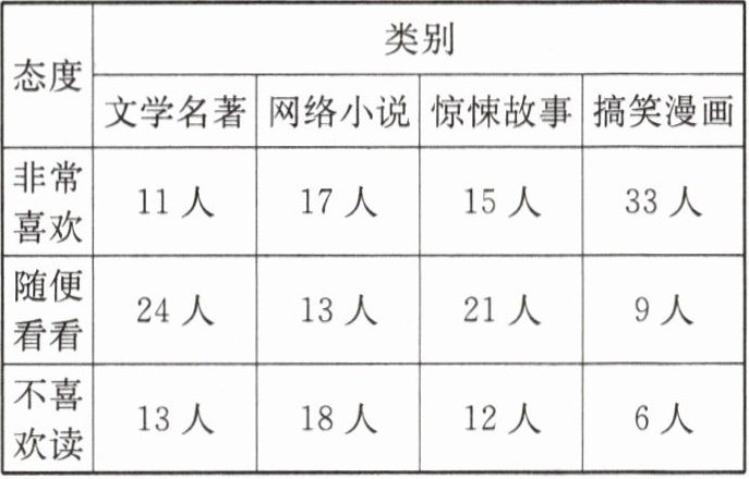 (2)【研讨阅读】活动过程中,小文同学展示了她收集到的一组数据,请你依据表格数据,从阅读类别和阅读态度两个方面给同学提出合适的阅读建议。(4 分)