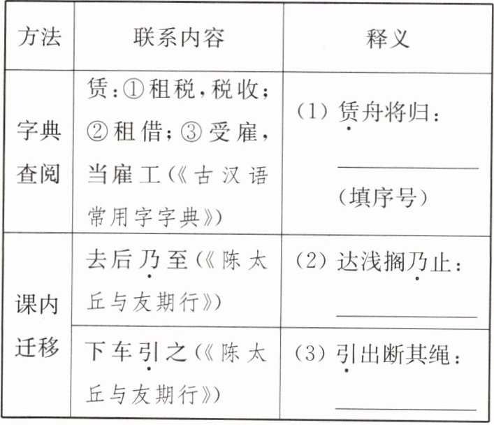 |字典查阅|赁:①租税,税收;②租借;③受雇,当雇工(《古汉语常用字字典》)|(1)赁舟将归:______(填序号)|