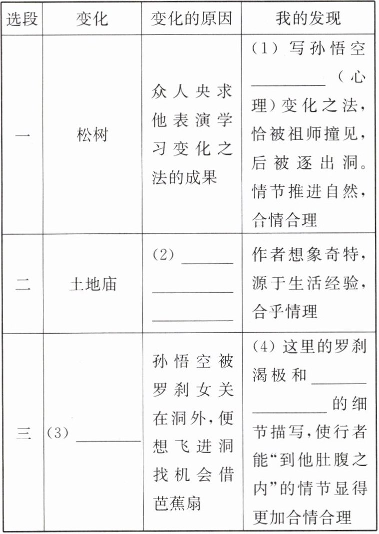| 三 | (3)______ | 孙悟空被罗刹女关在洞外,便想飞进洞找机会借芭蕉扇 | (4)这里的罗刹渴极和______的细节描写,使行者能“到他肚腹之内”的情节显得更加合情合理 |