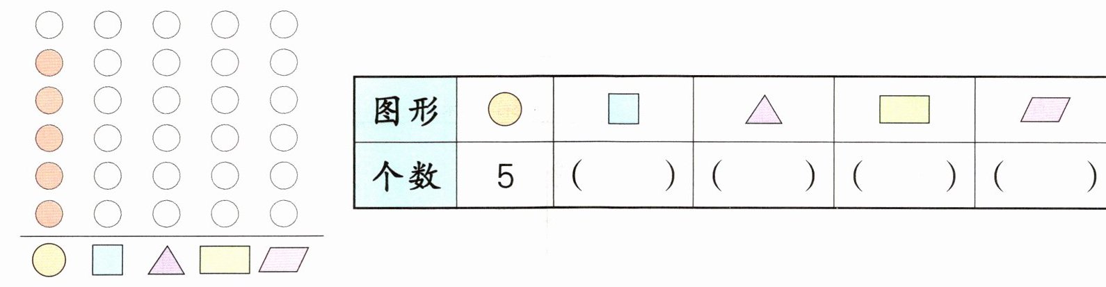 (1)把上面的图形分一分,数一数,涂一涂,在下面的表格中填一填。