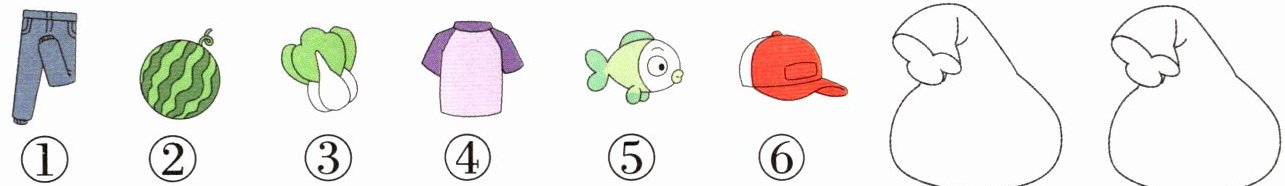 解析:根据生活常识,裤子、上衣和帽子属于服饰类,所以①④⑥放到一个袋子中;西瓜、白菜、鱼属于食物类,所以②③⑤放到一个袋子中。