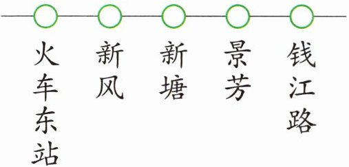 5. 阳阳一家去杭州游玩时乘地铁出行。他们在火车东站上车,景芳站下车。地铁每行驶1站大约需要4分钟,他们大约需要乘坐(