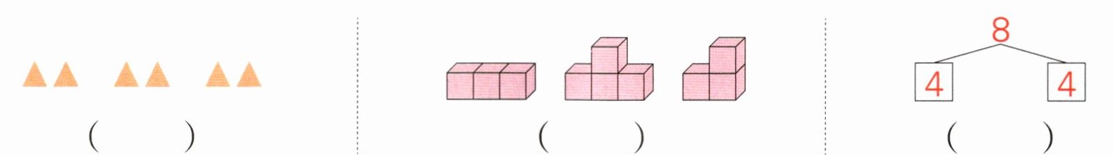 3. [教材改编]老师把8朵小红花平均分给上课积极发言的小朋友。在正确分法的( )里画“√”。