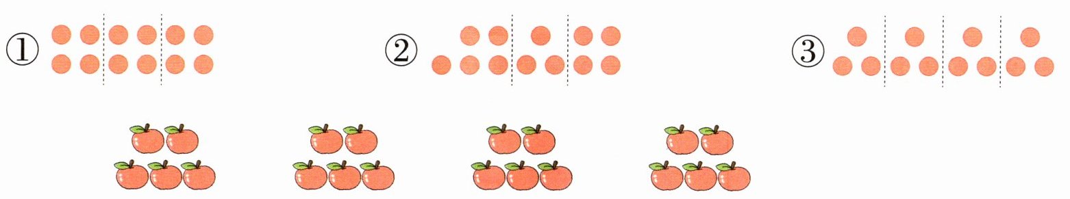 3 解析:一共有12块蛋糕,平均放到4个格子里,即把12块蛋糕平均分成4份,求每份是多少,借助学具分一分可知,每份是3块,即每个格子里要放3块蛋糕,从第三个格子中拿出一块放到第二个格子中即可。