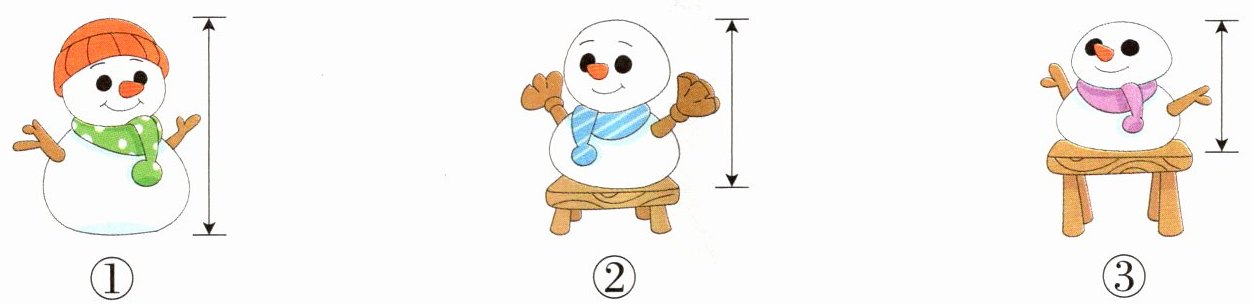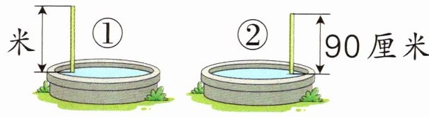 ② 10 解析:用两根同样长的竹竿测量两个水池里水的深度,①号水池水面上露出的竹竿长1米,1米=100厘米,②号水池水面上露出的竹竿长90厘米,因为100厘米>90厘米,所以②号水池水下竹竿的长度大于①号水池水下竹竿的长度,所以②号水池里的水深一些。100-90=10(厘米),②号水池比①号水池里的水深10厘米。