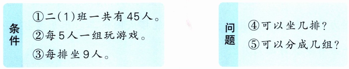 (答案不唯一) ① ② ⑤ 45÷5=9(组) 口答:可以分成9组。