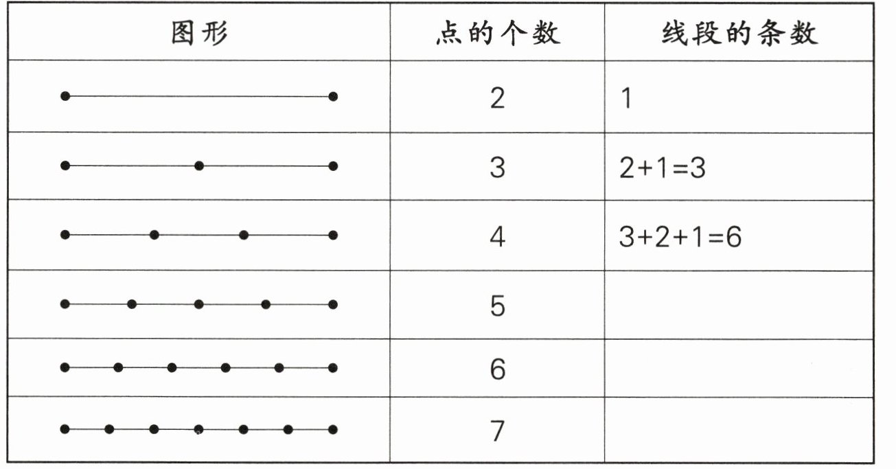 (1)我发现:先数出一条线段(包括两端)上点的总个数,再把小于这个数的所有非零自然数相加,它们的(和